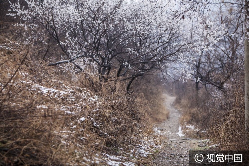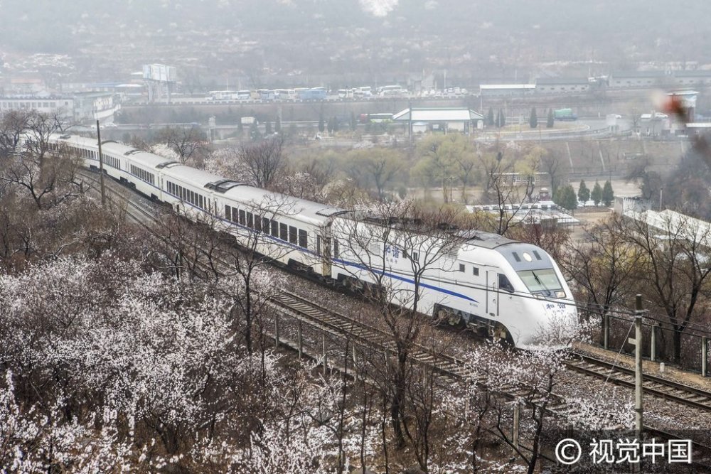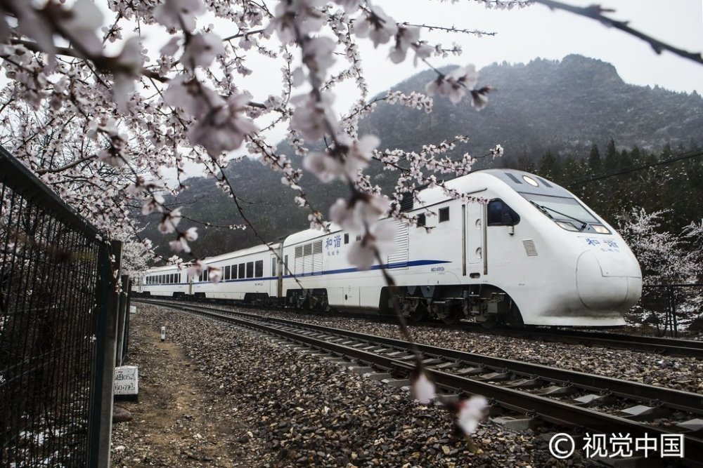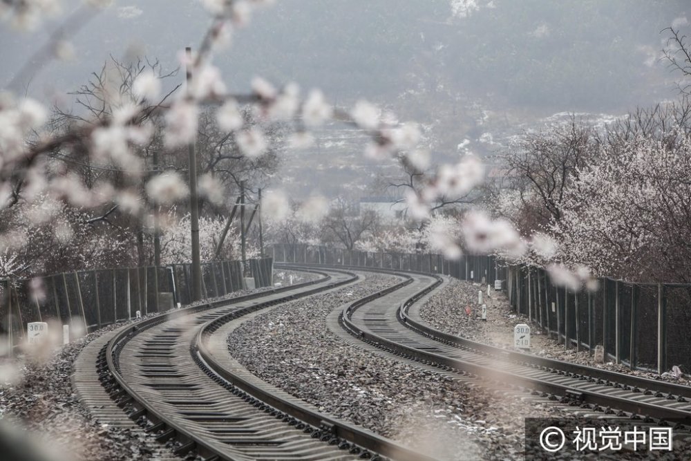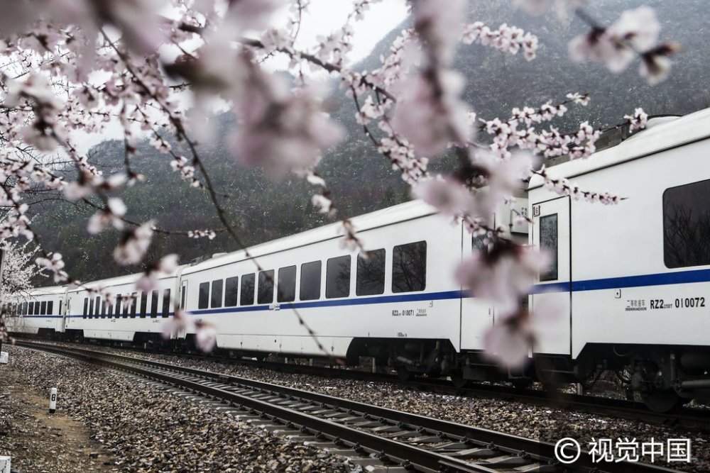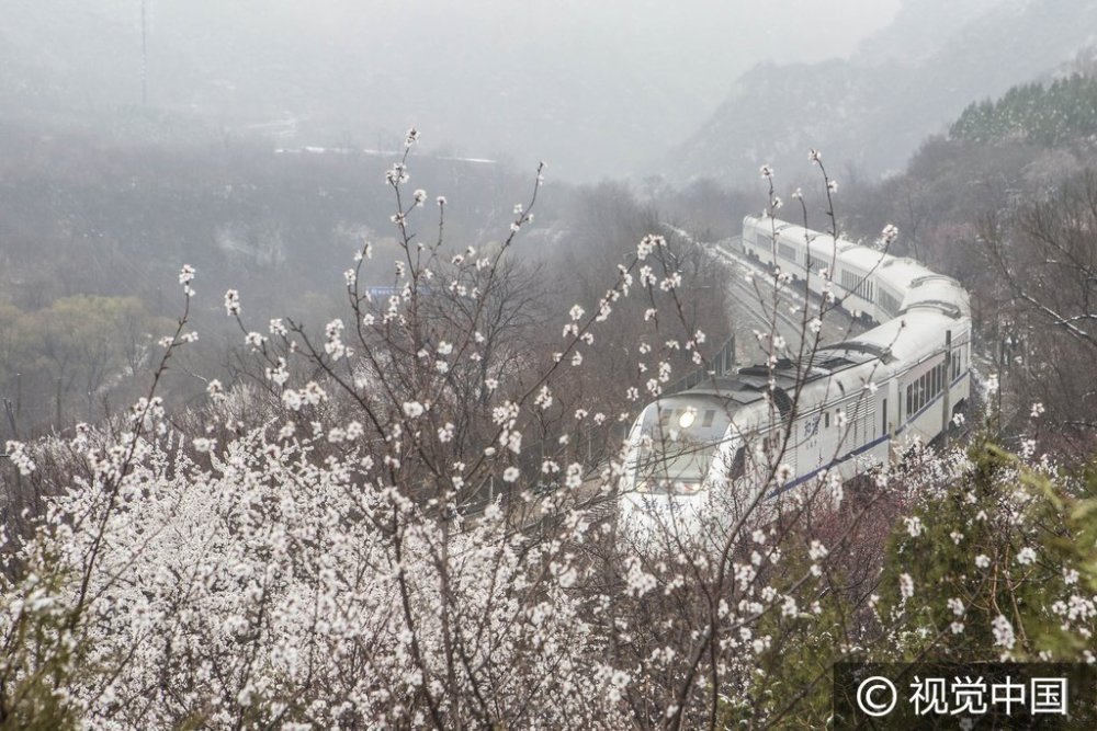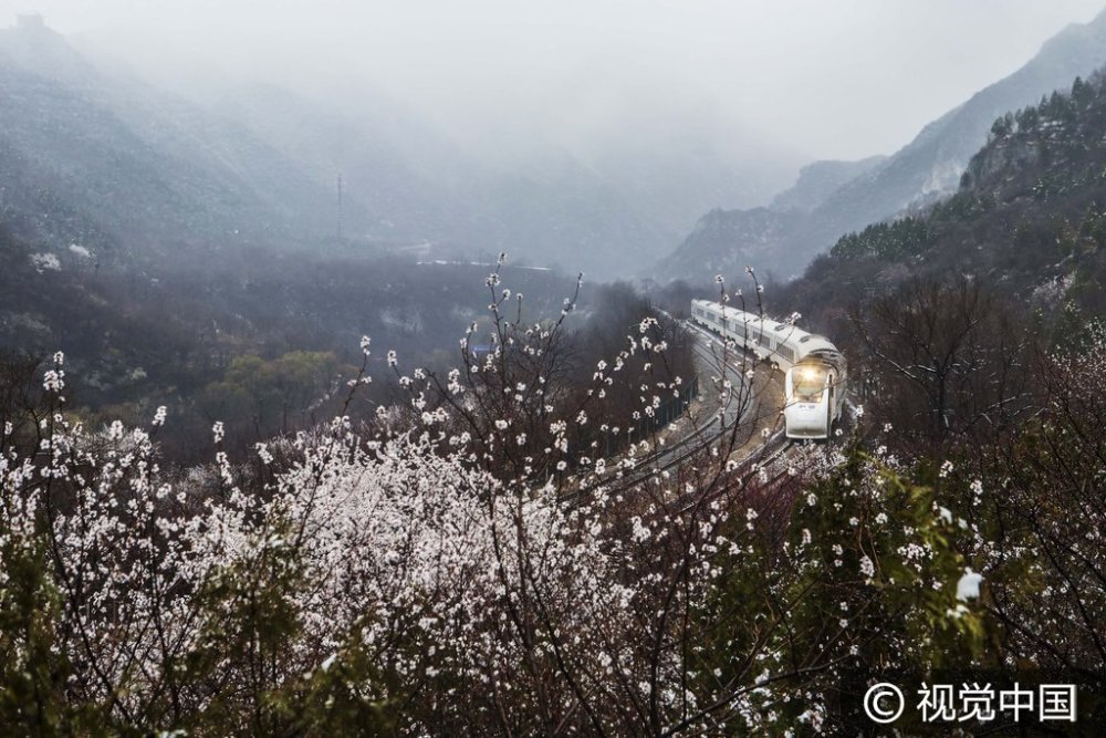 2017年3月24日,北京。阳春三月,受冷空气影响,当日北京迎来了一场春雪,居庸关长城脚下,雾气蒙蒙,洁白的残雪与烂漫的山花相映,列车穿越花海演绎别样铁道风情,让人流连忘返。