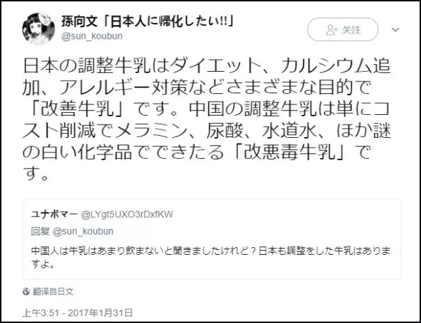 “把日本的牛奶加入1/4的水,再加糖,就是中国产牛奶的味道。