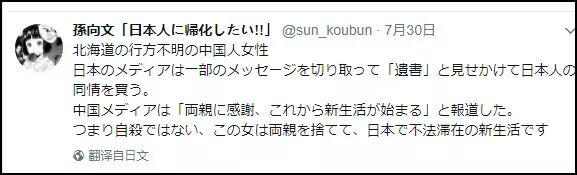 “日本媒体发布‘遗书’,就是为了换取日本人的同情。中国的报道是‘谢谢父母,准备开始新生活了。’所以说她不是自杀,就是抛弃了父母,在日本非法躲藏下来了。”