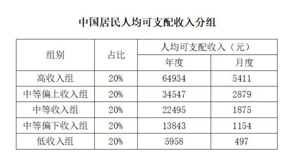 事实是中国并没有你想的那么富有。据国家统计局在2019年1月8日发布的《中华人民共和国2018年国民经济和社会发展统计公报》显示,2018年全国居民人均可支配收入28228元,城镇居民人均可支配收入39251元,也就是人均月可支配收入3270元;农村居民人均可支配收入14617元,也就是人均月可支配收入1218.5元。如果将全国居民人数五等分,我们可以更直观的看到收入水平的分布情况。