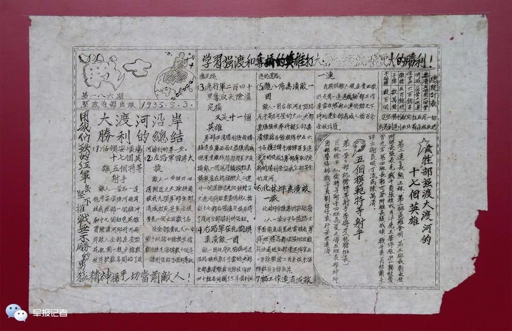 1935年5月26日(即红军强渡大渡河后的第3天)印发的红1军团主办的《战士报》第184期,上面刊登了一篇题为《十七个强渡的英雄》的文章,简要介绍了红军强渡大渡河的战斗经过。