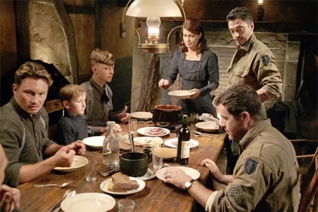 小木屋的温暖、食物的香气、伊丽莎白慈母一般的热情与平和,让士兵们紧绷的神经慢慢松弛下来。美国兵将自己的香烟盒掏出来,请德国士兵抽烟,德国兵则从背包中拿出一瓶红酒和一块面包,与大家分享。