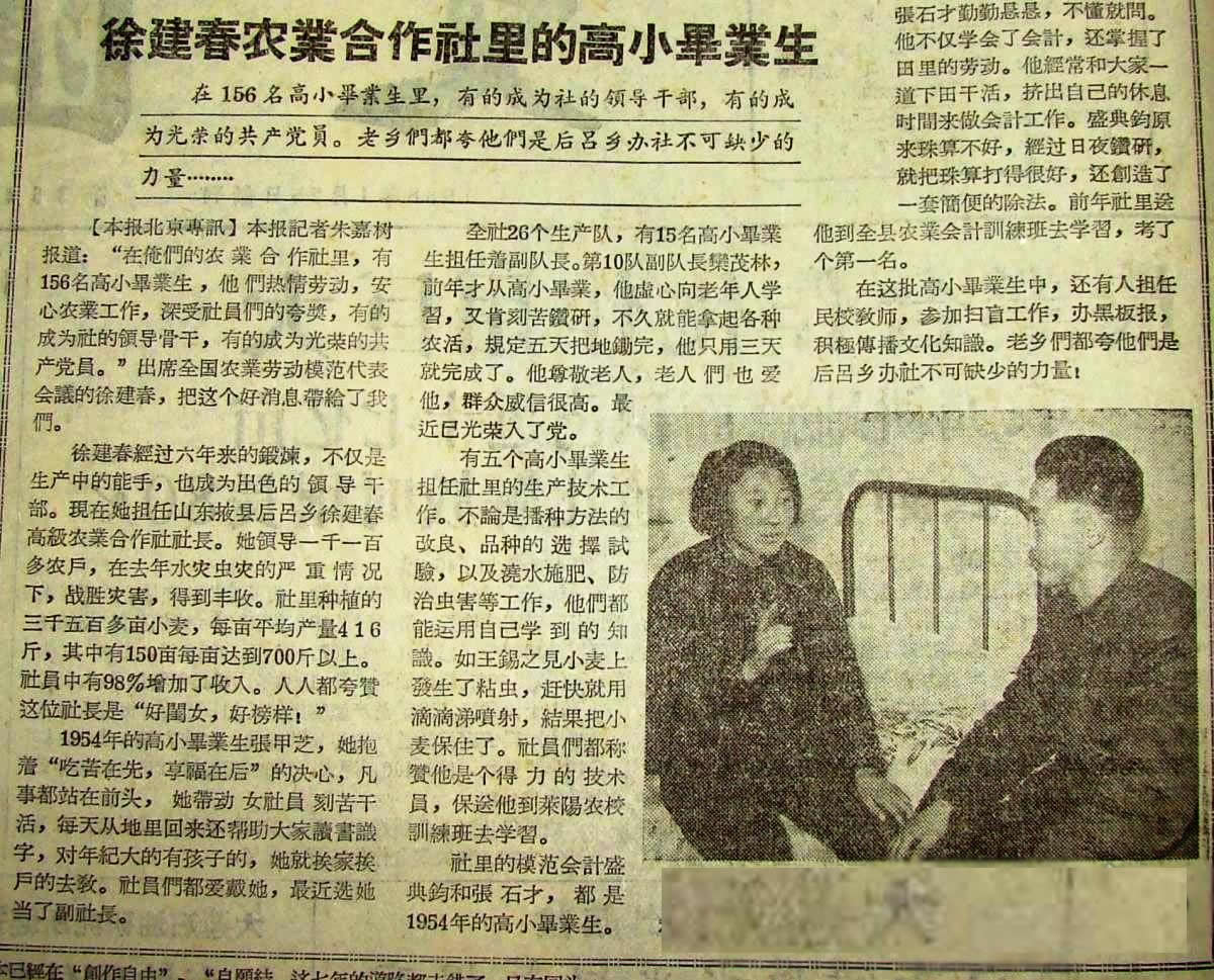 1954年3月12日,《人民日报》转载了山东《大众曰报》的文章《徐建春一一农村知识青年的好榜样》。作为党报,《人民日报》具有强烈的导向性,正式树立了徐建春先进典型的形象。