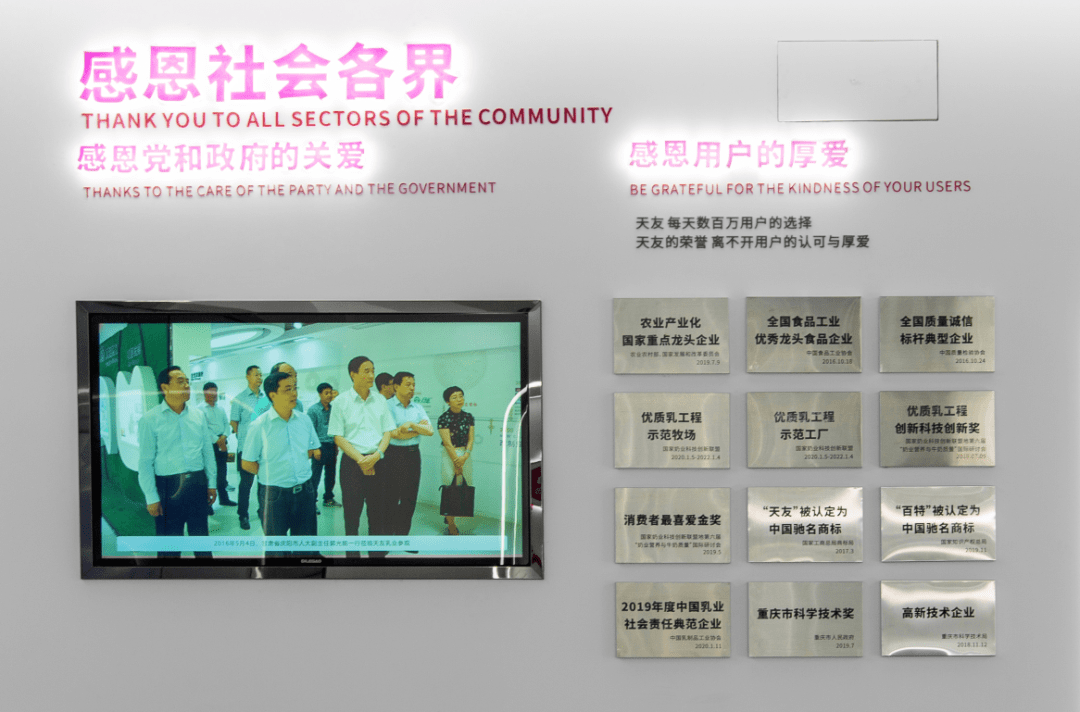全国百佳质量诚信标杆示范企业、最具影响力品牌、消费者最喜爱金奖、优质乳工程创新科技创新奖、农业产业化国家重点龙头企业、中国乳制品10强企业……讲述出来的这一切,对于天友来说仅仅是九牛一毛,这是这个重安全重科技的乳制品企业九十年耕耘后,应得的荣誉。