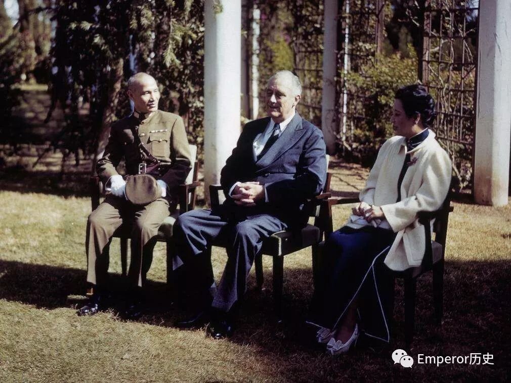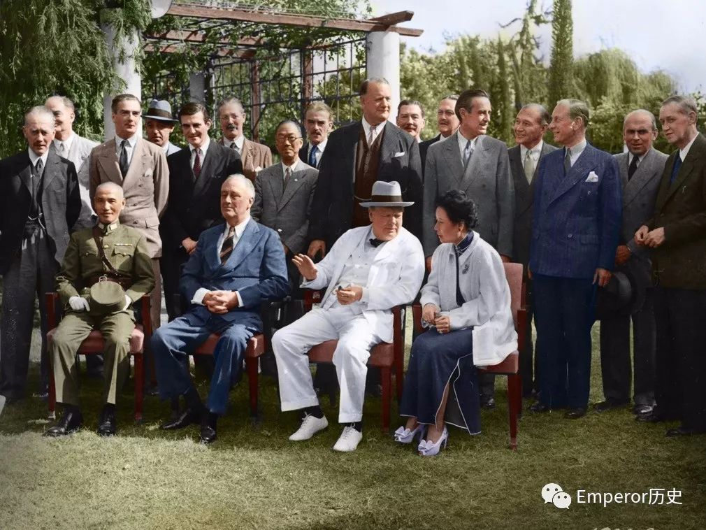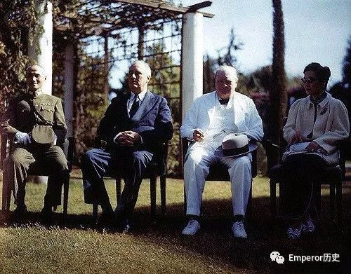 (图为蒋介石、罗斯福、宋美龄在埃及米纳饭店的合照,这时英国首相丘胖子已经先走了)