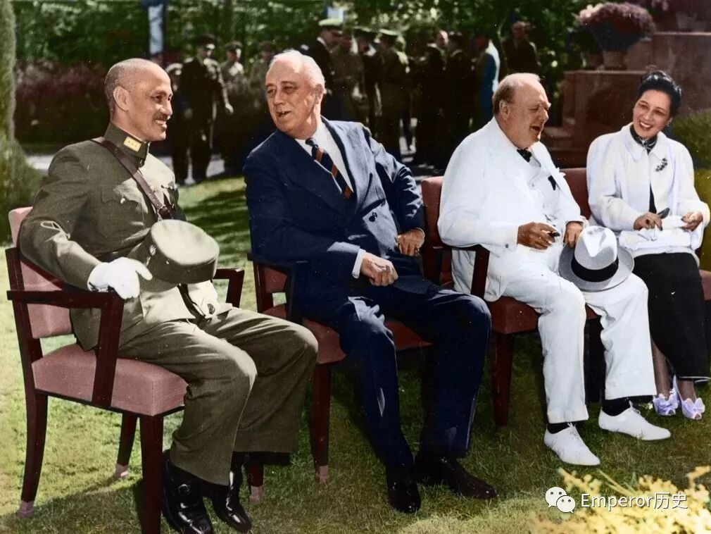 (图为开罗会议期间,蒋介石正与罗斯福笑谈,宋美龄则陪丘吉尔聊天)