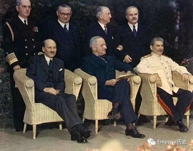 图为1945年7月,美国新任总统杜鲁门、英国新任首相艾德礼、和斯大林在波茨坦会议后期的合照。艾德礼在英国新的大选获胜,取代丘吉尔;罗斯福于1945年4月病逝,杜鲁门继任为新总统;所以二战“六巨头”是:罗斯福、斯大林、丘吉尔、蒋介石、杜鲁门和艾德礼)