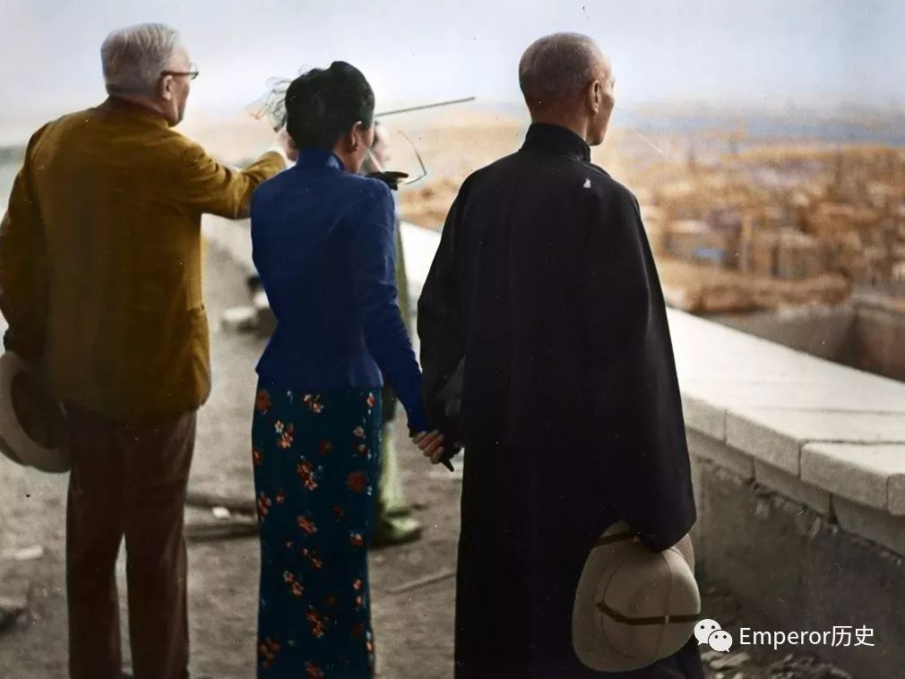(图为1943年11月27日,蒋介石宋美龄夫妇手牵手站在开罗某处古迹的楼顶俯瞰整个开罗城,鹣鲽情深,旁边的罗伯特爵士正用手杖指着城里某处讲典故)