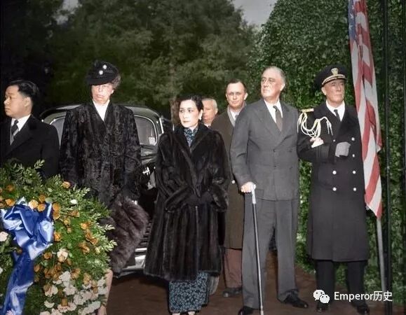 (图为1943年2月22日,宋美龄以罗斯福总统夫妇的私人朋友身份客居白宫期间,与罗斯福总统夫妇一行拜偈了华盛顿墓;从左至右分别为孔令侃、罗斯福总统夫人埃莉诺、宋美龄和罗斯福总统;宋美龄此行的目的是为蒋介石参加开罗会议而做准备)