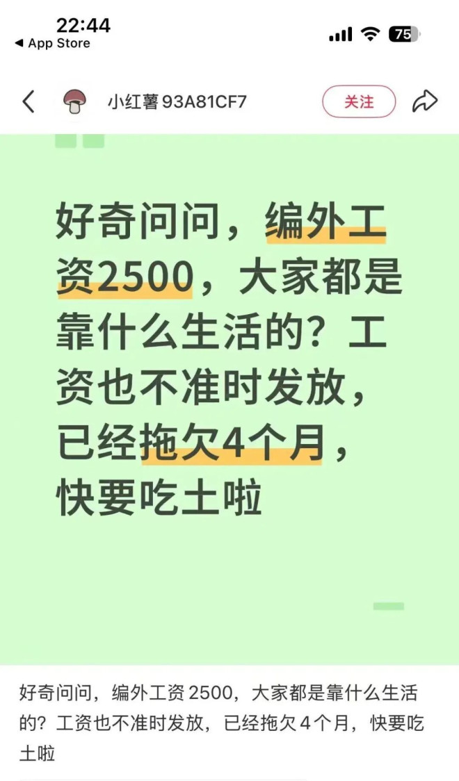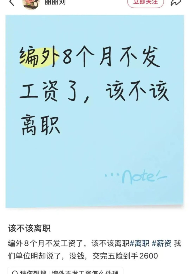 类似的抱怨,在网络上也并不少见。许多编外人员纷纷诉苦:每月到手工资不过两千多元,还常常面临被拖欠的情况。