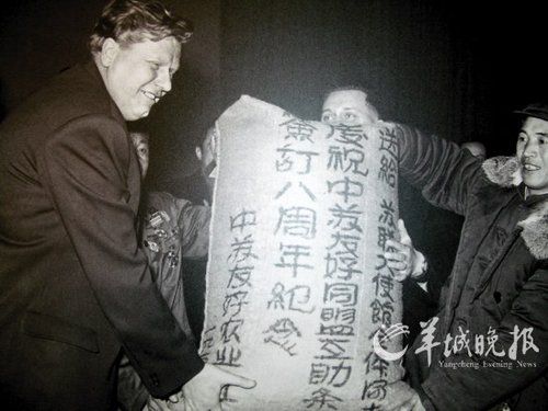 1958年,中苏友好人民公社向苏联驻华大使馆参赞苏达利柯夫赠送农产品