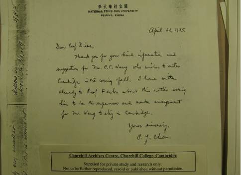 王先生将在这个月底前往欧洲,根据教育部最近的校准,他的全名王治淇(Chu chi Wang)已经变成了王竹溪(Wang jwu shi)(笔者注:王竹溪,名治淇,号竹溪)。我希望在他到达英国后,您能给他所有的帮助,让他进入剑桥大学。