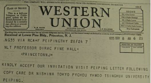 1935 年5 月7 日,周培源和吴有训(1897—1977)得知狄拉克将要访问日本,于是两人以清华大学名义向狄拉克发出邀请,希望他能在结束对日本的访问之后到访北平。周培源和吴有训通过西部联盟公司给狄拉克发了电报,内容如下: