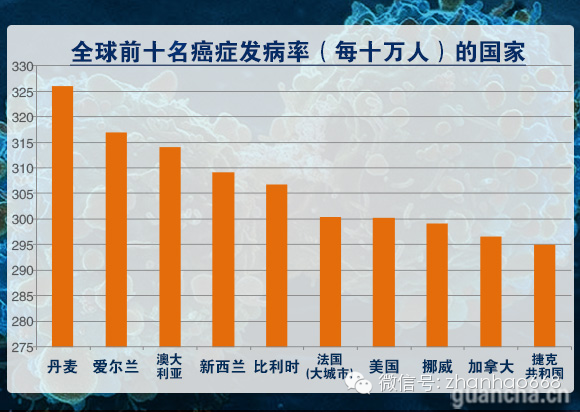 更令人吃惊的是,印度和中国都是污染大国,但在癌症发病率中都排不进世界前十,排进世界前十的癌症发病率国家全都是好山、好水、好空气的国家。根据2011年英国发布的数据,癌症发病率前十名的国家分别是丹麦、爱尔兰、澳大利亚、新西兰、比利时、法国、美国、挪威、加拿大和捷克(如下图),这里边除了捷克相对落后外,其它都是空气新鲜和水污染少的西方发达国家。