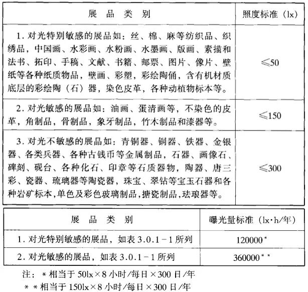 ▍国家文物局于 2000 年颁布的《博物馆照明设计规范》中对于不同展品在展览时的照度和曝光量标准的要求