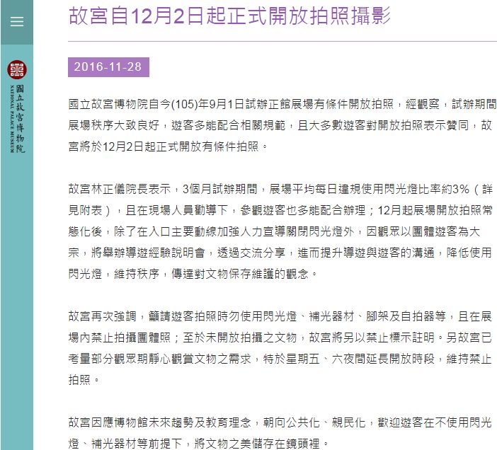 ▍台北国立故宫博物院于 2016 年 12 月 2 日开始对部分区域开放拍照