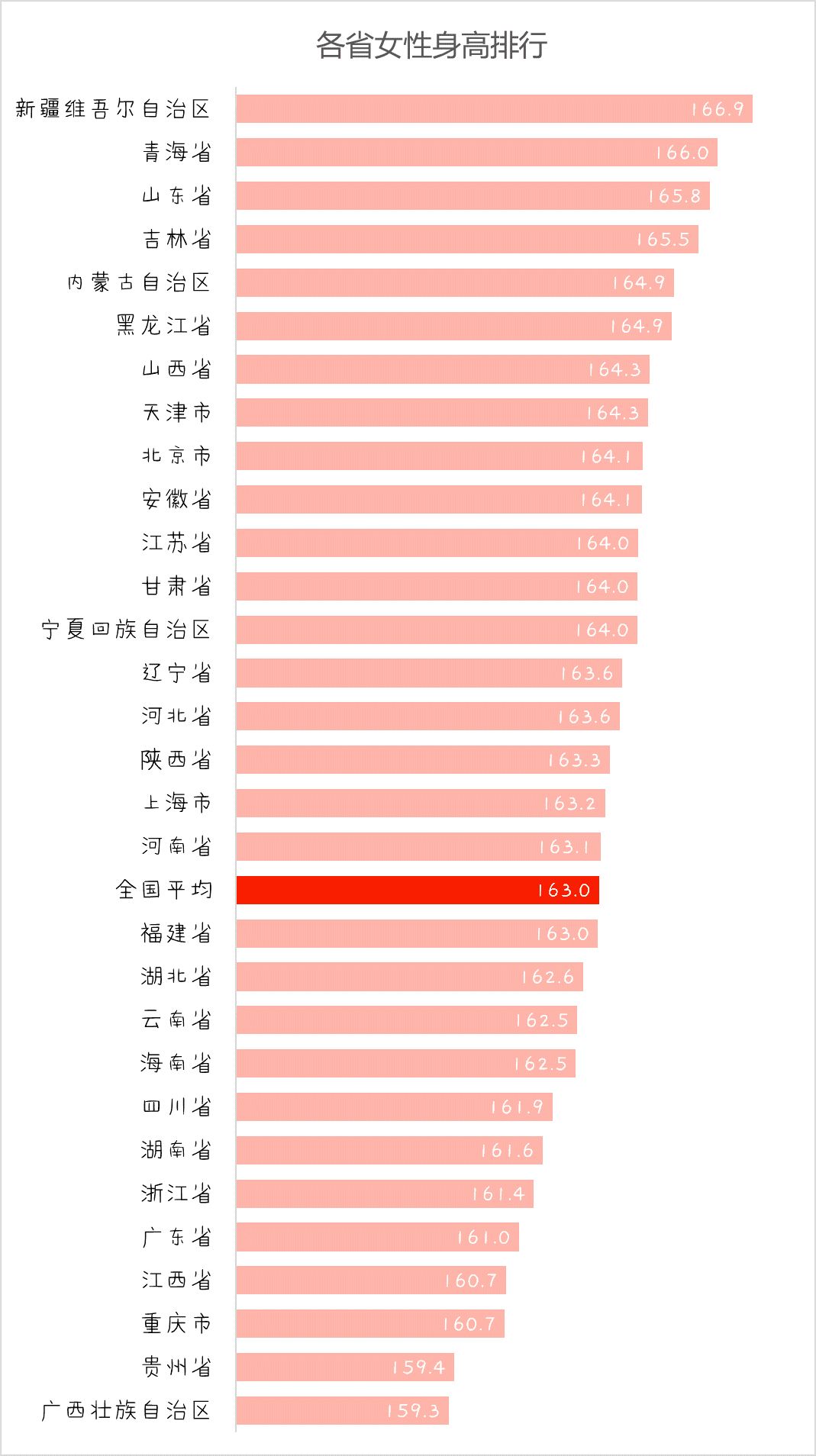 女性身高最高的是新疆 166.9cm,其次为青海 166.0cm。