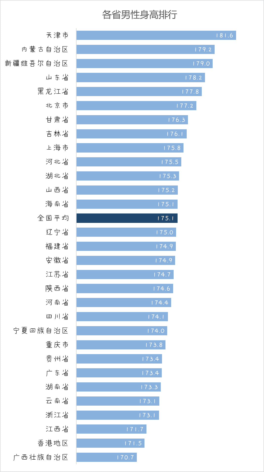 在男性身高高于全国平均值(175.1cm)的省份地区中,只有上海市、湖北省和海南省在地理位置上位于秦岭-淮河以南,其余均处于北方。