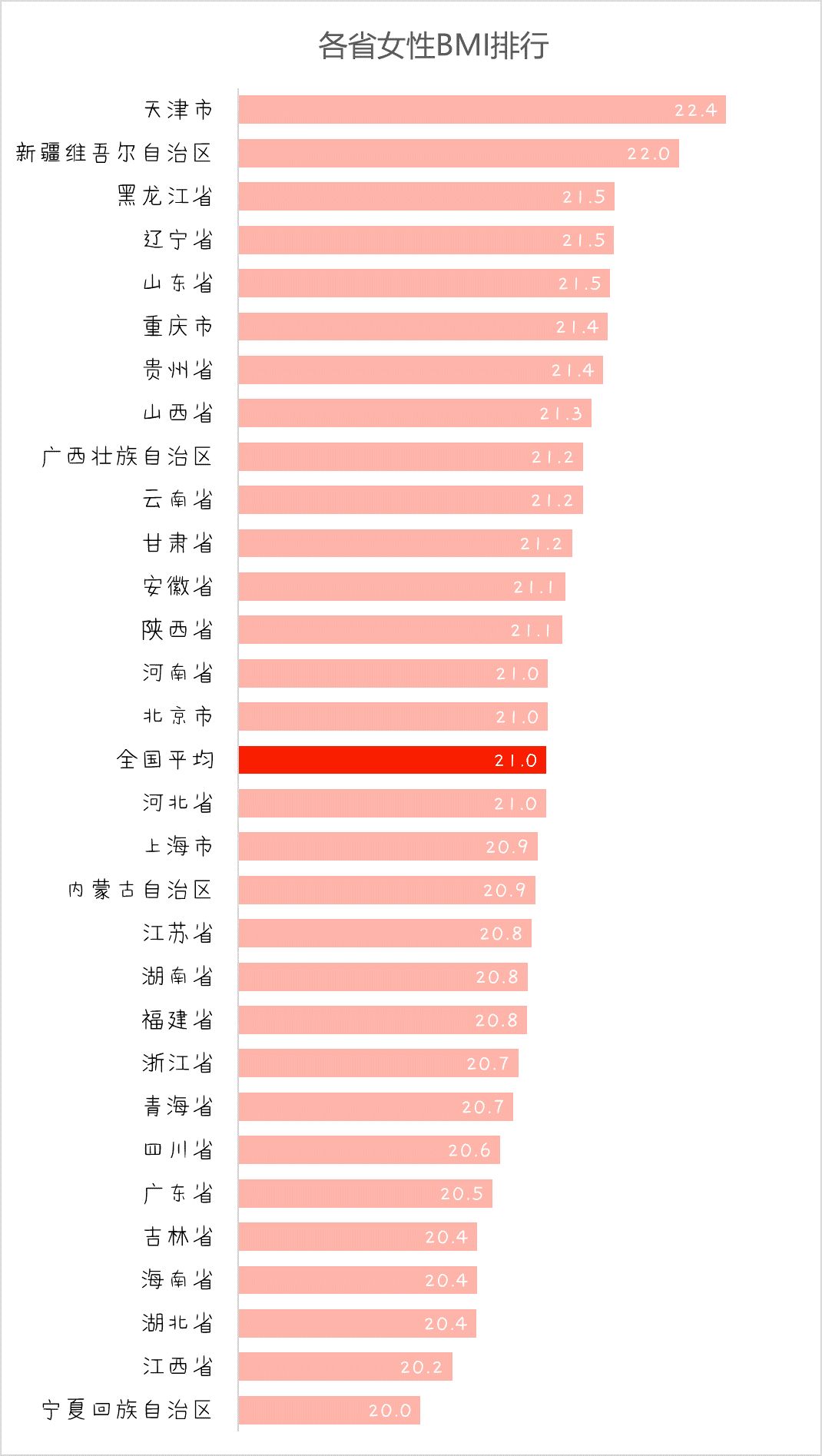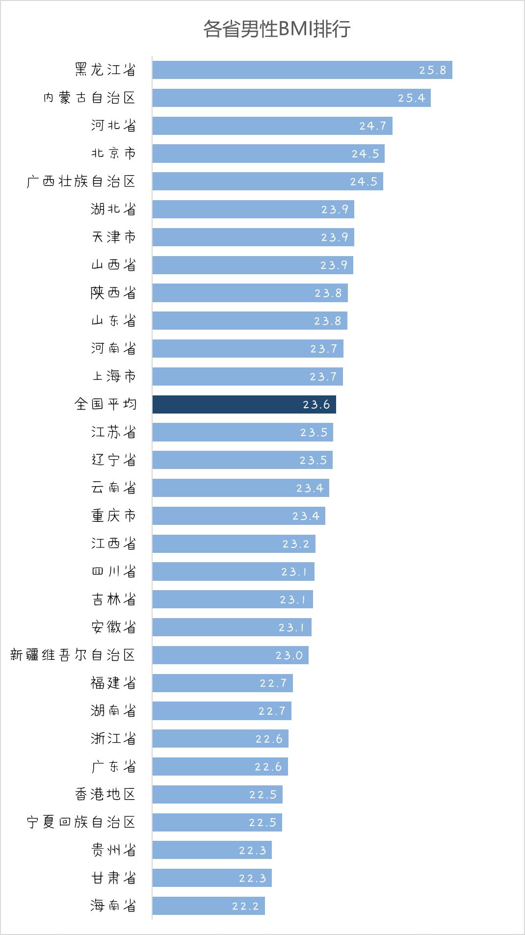 接下来可以看一下分省的 BMI 均值,仔细分析后会发现,不同省份对于该地区肥胖率的贡献程度并不相同。