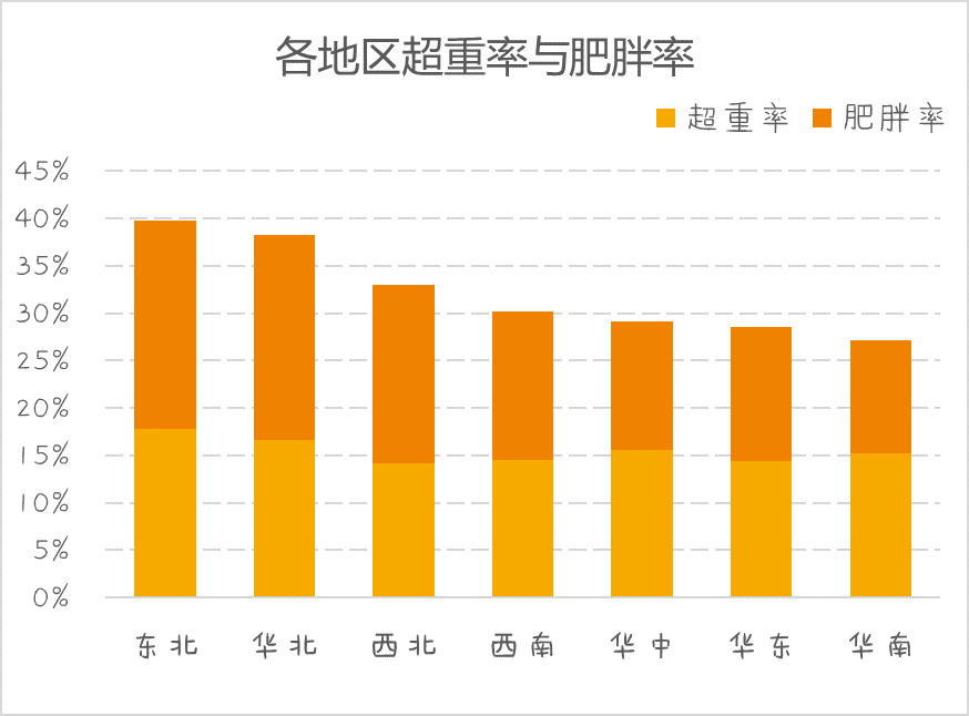可以看到东北和华北地区的肥胖率遥遥领先于其他地区。