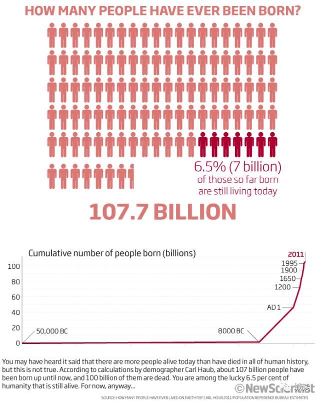 人类有史以来,累计已有1077亿人出生。今天世界生活着的70余亿人口,只占人类历史上所有出生人口的6.5%。