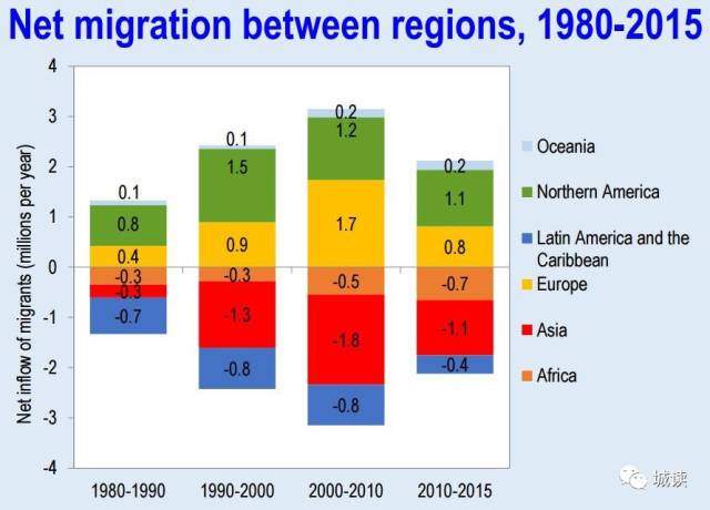 1950-2015年,欧洲、北美和大洋洲为国际迁移人口净输入地区,而非洲、亚洲、拉丁美洲和加勒比地区为国际迁移人口净输出地区。