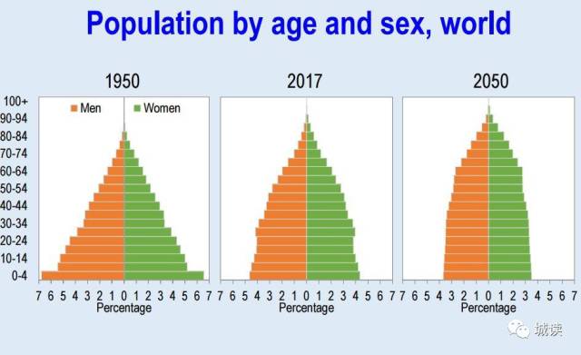 1950 年的世界,年轻人数量远远多于老年人数量。2017年,年轻人越来越少,老年人越来越多。2017年,世界年龄在60岁及以上的人口达9.62亿,占世界 人口的13%,老龄化在以每年3%的速度增长。目前欧洲老龄化程度最高,60岁及以上人口占比25%。至2050年,世界各个区域(非洲除外)的老龄化程 度将达到25%甚至更高水平。
