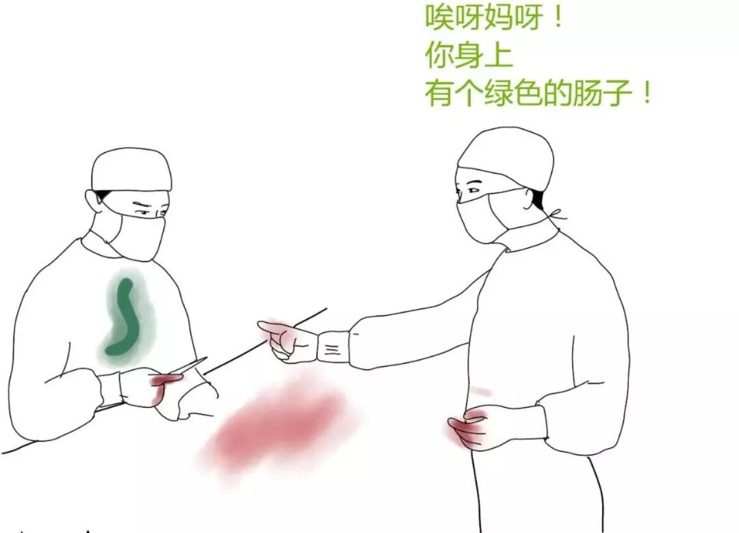 如果他们突然看向同事的白衣服,或者白色的墙壁,就会看见蓝绿色的“幽灵”,比如在同事的白大褂上看到一条绿色肠子……
