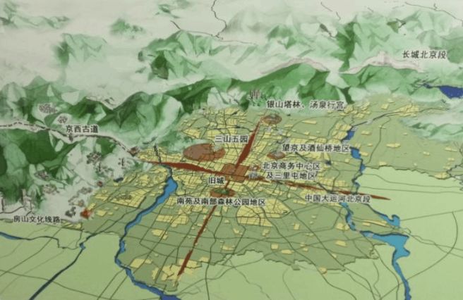 北京目前的中轴分为三段,中部是传统轴线,代表历史纪念,而北部是时代轴线,南部是未来轴线。南部的轴线从永定门向南一直延伸到新机场。