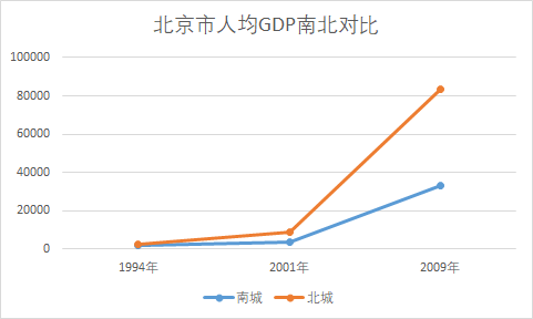 今日,这种南北差距反而越来越大。老东西城区、海淀区和朝阳区(以下简称北城)不但人均 GDP 绝对值高过老崇文区、老宣武区和丰台区(以下简称南城),增速也更快。