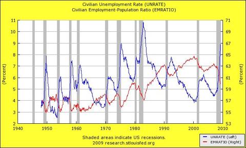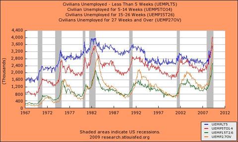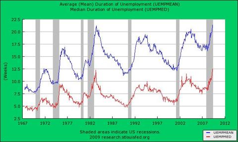 http://seekingalpha.com/article/137144-a-closer-look-at-the-unemployment-numbers?source=article_*****_picks The employment report for April was by and large treated as good news by the market, since "only" 539,000 jobs were lost in the month, and there were fears that it could have been much worse. However, having had a weekend to reflect on the news, let's dig a little deeper into the employment situation. In the yellow graph, I plot the unemployment along with the employment to population ratio, which one could think of as the employment rate. The two will of course not add to 100%, unless we seriously repeal the child labor laws and get all those lazy 3-year-olds bringing home a W-2. However, in many respects, the employment rate is just as important as the unemployment rate. Ultimately, it is incumbent on those working to support those who are not, and the higher the percentage of the population that is working, the easier it is to support those who are not. As one would expect, the employment rate and the unemployment rate are negatively correlated, but far from perfectly. During the post-war period, the unemployment rate has been volatile, but there has been no real long-term trend to it. In contrast, there was a secular rise in the employment rate, starting in the early 1960's until the end of the century. That secular rise was due to seeing the words "women" and "labor" meaning something more than childbirth. However, the recovery after the 2001 recession did not bring the employment rate back to anything close to the previous peak. The current recession has caused the employment rate to fall off a cliff. Declines are normal during a recession, but this is one of the largest ones on record. Note that until the 1991 recession, the unemployment rate would fall and the employment rate would rise almost exactly at the end of the recession. The last two recessions have been very different in this regard, with the employment situation deteriorating for more than a year past the end of the recession. While there are some tentative signs that the current recession might be coming to an end, I would not expect a quick improvement in the jobs picture. [click to enlarge] In the green graph, we look at not just the rates of unemployment (and employment) but at the length of time people are out of work. Note that in the good times, the length of time that those who lose their jobs are out of work tends to fall, but with each passing recovery, it ends up at a higher low. The decline does not start right away though, and the length of the delay in starting the decline seems to be increasing with each economic cycle. This was particularly acute in the last recovery, particularly when measured by the average (mean) length of time people were out of work. Also note that both the mean and the median length of unemployment are now at all-time records, and the recession is not over yet (as far as we know). The lengthening of the mean unemployment duration was particularly acute in the April report, jumping 1.3 weeks versus just 0.3 weeks in March, unchanged in February and up just 0.1 week in January. The median showed a similar pattern. What this suggests to me is that while the pace of layoffs may have slowed, so has the pace of new hiring. To me, the most convincing "green shoot" I have seen so far is the downturn on the four-week average of new unemployment claims. Fewer layoffs and fewer new hires would be consistent with this. [click to enlarge] So where is this rapid increase in the length of unemployment coming from? The orange graph breaks out the unemployed by duration of unemployment going back to 1967. Note that the very short-term unemployed -- those who just got their pink slips and have been out of work for less than five weeks (blue line) -- actually fell in April. Almost always, this makes up the single biggest group of the unemployed. The system needs some people to be unemployed at any given time, but if those people are only out of work for a few weeks, it does not cause any great hardship. Note that the absolute level of short-term unemployed today is at levels that would have been considered normal from the late 1970's through the mid 1990's. (Population has grown significantly since then as well.) It is the other groups of unemployed that are of more concern. Most notable is the increase in the number of people who have been unemployed for more than 27 weeks. While the extension of unemployment benefits in the stimulus bill helps somewhat, we are now looking at an unprecedented number of people who are going to be in severe financial distress due to lack of work. For the first time on record, the number of long-term unemployed has topped the number of short-term unemployed. Indeed, since 1948, the ratio of short-term to long-term unemployed has only fallen below 2.0 19% of the time. Its long-term average is 4.5, although that is skewed by very high values back in the 1950's and 1960's (not shown on the graph). Since 1980, it has averaged 2.7, and has been below 2.0 35.5% of the time. [click to enlarge] Generally when someone becomes unemployed, there is an immediate decrease in their spending. Some of this is simply because the person is no longer spending on work-related expenses, such as commuting and eating lunch in restaurants (usually low end). If the person thinks that the period of joblessness will be brief, he or she will continue with many ongoing expenses. Why quit the country club if you will be back working in a month? Use the time to lower your handicap instead! Why drop HBO from your cable service when now you actually have a chance to watch it? However, as the length of time one is out of work drags on, more and more of those non-essential expenses have to drop by the wayside. Unemployment benefits generally cover only about 60% of what people were taking in while they were on the job. So people have to draw down on their savings to get by. Given the abysmally lo