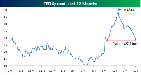 不确定性:能量(世界)是不连续(不同质连续)的,牛顿世界观及物理量纲比如时间是连续的 爱的局部坐标系,量子力学及粒子物理的量子,本质上都是不连续的,但牛的平直时空世界观,爱相对论及现代物理的许多物理量纲比如时间是连续的方法论,测量因此是本质上矛盾和不确定的,比如 经典力学,连续是宏观的比如统计 Below we highlight the movement in the TED Spread over the last 12 months. For those unfamiliar with the indicator, the TED spread measures the difference between the three-month T-bill interest rate and three-month LIBOR. When the spread is high it is indicative of a higher level of perceived risk in the credit markets as banks increase the rate at which they are willing to lend to each other. Based on the movement in this indicator, investors are once again embracing risk. Since peaking out at 48.6 basis points (bps) back in mid June, the TED spread has now narrowed by over 40% and is now at its lowest levels since May 11th. click to enlarge About the author: Bespoke Investment Group