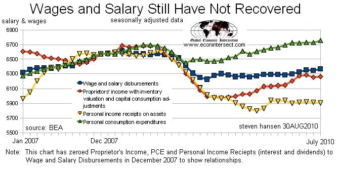 http://seekingalpha.com/article/222955-why-it-is-income-not-expenditures-that-are-limiting-economic-growth Daily, economic articles state that the “recovery” from the Great Recession is constrained by consumer spending. Keep this in mind when reviewing the July 2010 release of "Personal Income and Outlays." This is the headline: Personal income increased $30.0 billion, or 0.2 percent, and disposable personal income (DPI) increased $17.6 billion, or 0.2 percent, in July, according to the Bureau of Economic Analysis. Personal consumption expenditures (PCE) increased $44.1 billion, or 0.4 percent. In June, personal income decreased $2.7 billion, or less than 0.1 percent, DPI decreased $0.2 billion, or less than 0.1 percent, and PCE decreased $4.0 billion, or less than 0.1 percent, based on revised estimates. Real disposable income decreased 0.1 percent in July, in contrast to an increase of 0.1 percent in June. Real PCE increased 0.2 percent, compared with an increase of 0.1 percent. This release is a summary of an update to the National Income and Product (NIPA) tables, which provide 32 lines of breakdown and analysis for each month. You have read the headlines, and now we will look at the analysis. From a shear numbers point of view, consumer expenditures (personal consumption expenditures) are no longer in a depression – and are at the highest level since this data series began. Only per capita spending still has not fully recovered but is trending up. The total $30 billion gain in personal income came from private sector wages and private sector benefits on wages. Incomes have not recovered to pre-Great Recession levels. Picking a few elements of income, you can see the weakness: (Click to enlarge) At this point, it is more likely that it is income, not expenditures, which are limiting economic growth. The consumer is doing his job in supporting the economy. But this is where low interest rates become a double-edged sword, reducing income, and furthering poor economic conditions, which hurts mom and pop businesses. This comes on the heels of the second GDP release, which was analyzed in More Monetary Policy Stimulus Cannot Correct Poor GDP Growth. Without higher incomes, this recovery will continue to be stagnant.