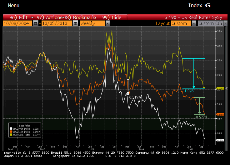 QE 2 Much Tuesday, October 05, 2010 TMM make no secret of the fact that they struggle with the current love-athon in bond markets which rests on the idea that rates will be held low until the year 3000 along with FOMC LLC's asset allocation switch out of paper & ink and into USTs. The price action across assets and, in particular, the Dollar & Treasuries are clearly indicative that the macro community has decided that *this* is "The Trade" for Q4. And it may well be, but the speed with which things have moved gives TMM grounds for caution. As TMM's good friend Mr Macro at Nomura is fond of saying, QE is designed to increase inflation expectations, so if there is an open-ended commitment to undertake further QE until inflation is sufficiently high (the Fed's unofficial core PCE target is ~1.75%, with the core CPI sitting about 0.5% higher than that), then buying 10yrs at 2.45% is going to produce a real return of something like 20bps. It just does not make sense. "Ah", you say, "but that is the point, to get real rates as low as possible". Well, Team Easy B have certainly managed that, sending 5yr real rates negative and 10yr real rates to around 0.65% - not much higher than the above back-of-the-envelope calculation. In fact, since equity markets peaked in April, the 5yr real rate has fallen 63bp (see chart below, white line), the 10yr real rate has fallen 75bps (orange line) and the 5y5y forward real rate (i.e. the market's view of the long-run real rate of return, usual TIPS-related caveats apply) has fallen over 100bps. Following the line of argument that QE lowers real rates, we can see that when the Fed announced QE back in March 2009 the 10yr real rate moved by about 50bps, as did the 5y5y real rate. In recent weeks, as the market has moved to expect more QE, they have both moved about 57bps. Now, as QE is designed to increase inflation expectations and support growth, if the Fed is successful, one would expect the long-run real rate (which is essentially a measure of real trend growth) to mean-revert back towards the 2-2.5% range. Post-QE1, this did indeed happen, even as the spot-starting real yields fell, reflecting easy policy in the near-term but "normal" policy (if there exists such a thing), in the medium to long-term. Sure, it's possible that it stays low or moves even lower, reflecting Ben's bid, but the inflation expectations component of yields will have to move higher. On this metric, at least, it doesn't look like there is much room for nominal yields to rally much further. So just how much QE is the market expecting? A number of academics have attempted to answer this question, but it's obviously pretty difficult and subjective to attribute just how much of market moves are due to QE announcements. In fact, many of these attempts are more propaganda pieces aimed at showing people just how well central banks did (read any BoE report on this for more details...!). Now TMM is unconvinced that QE operates through anything other than the "shock and awe" channel, which is policymakers' best weapon in the fight to reflate markets and animal spirits. Its use in March 2009 was clearly along this line, though the recent arguments from various Fed members have been more along the lines that the Fed will drip feed QE on a month by month basis. The trouble with this approach is that the market is a heroin addict and the effect of each subsequent $100bn monetary hit fades away and soon enough we will be back in the situation whereby the Fed is labeled "out of bullets". TMM does not think this argument is lost on the Fed, though the loss of the outstandingly savvy Don Kohn makes the former more likely. But we digress. In TMM's view, one of the purest ways of working out the market's QE expectations is to look at the relationship between 12m T-Bills and excess reserves at Federal Reserve banks. Although not a perfect measure, under QE one would expect 12m bills to follow Fed excess reserves reasonably well as bank Treasury departments manage their short term cash balances. Certainly since the introduction of the 0-0.25% band for Fed Funds, this relationship has held well (see chart below, white line - 12m T-Bill yield, pink line - reserve balances). However, since the EMU crisis and the downturn in US economic data, this measure has diverged as expectations of further QE have grown, and is now consistent with the Fed's excess reserves expanding by ~$350bn to about $1.34tn. Now, TMM did a brief survey of some of their macro mates yesterday, yielding the expectation that the Fed will announce an initial programme of about $300bn, which is reasonably close to this number and, along with the moves in real rates goes a long way to suggesting that QE is already priced in by markets. Of course, markets are only really vulnerable to turns when positioning is all one way. As we have mentioned before, getting positioning data in the rates market is very difficult because so much of it is OTC. But one metric, TMM like to use is the CFTC duration-adjusted non-commercial speculator net position as a fraction of overall open interest (see first chart below) in USTs and a similar metric for Eurodollar futures (see second chart below). While these only capture a fraction of speculative positioning in markets, they *do* capture a significant portion of its *trend-following* position by virtue of how the droids CTAs execute their trades. As can be seen below, these are both at levels not seen since early-2008. In the context of hedge funds managing, say, 70% of the money they were pre-crisis and employing half the leverage, their power is something like 35% of what it was pre-crisis, so on this risk-adjusted basis, positioning is exceptionally long. The point here is that anything less than "shock and awe" QE is priced in, and *at best* bonds stay where they are, or at worst, a 2003-like reflationary-driven convexity sell-off is on its way.
