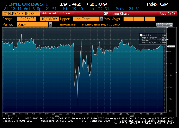 So that's the wonkish stuff out of the way. In the real world, these effects are usually dwarfed by longer-dated issuance being swapped between currencies for yield pickup by corporates and supra-nationals in the case of the medium/long-end, while in the short term by the immediate short-term funding needs of the banking system. The poster child for this was the EUR/USD 3m Basis (see chart below)in the immediate aftermath of the Lehman bankruptcy as foreign banks struggled to fund their USD assets via the FX Swap/Basis Swap markets. The EUR/USD basis moving negative has thus evoked memories of USD-funding shortages, most recently in late-April/May as concerns about the solvency of the European banking system in the presence of possibly insolvent sovereigns came to the fore.