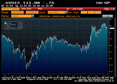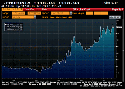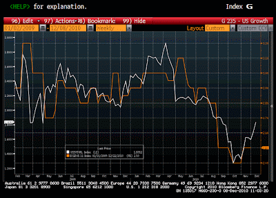 http://macro-man.blogspot.com/ 大趋势是有机的量子态,集体态,很多自由度组成,相对不易分解和定价;a+b=a+ab+ba+b,not 正交, can't be 容易被分解和投影,定价 短期投机容易被分解和投影,定价;a+b=a+b, a & b 正交 Bad day for Goldfinger, but worse for Mr Bond Wednesday, December 08, 2010 Well, TMM were happy with yesterday's Gold move, but they are sure they are not alone in cringing at the car crash that has occurred in the Treasury & FX markets overnight as Tens smashed through 3% and then proceeded to trade as low as 3.25% on the London open. Cue a barrage of excitable emails, Bloomberg messages and IBs from all corners of the market, intellectualising about how the Treasury move shows that the market is now worried about the sustainability of the US debt load, or that equities cannot rally with yields moving higher, or that QE2 has failed, or that mortgage convexity selling is about to send yields to 3.5% etc etc... Usually, TMM's "signal" for when things have gotten a bit overdone is when emails on rather complex subjects start to come from single stock equity guys or the FX market... we'll merely refer you to our Armchair Generals piece. But in seriousness, TMM have a hard time buying a lot of these arguments and we will attempt to explain why. In terms of debt sustainability, in our view, looking at US sovereign CDS is not particularly useful, given that US banks cannot trade it and given that most hedge funds have US banks as their prime brokers, there is little point in them trading such instruments, and as such, it is rather illiquid. However, the Treasury market and Overnight Indexed Swap (OIS) markets are very liquid. Now TMM is totally open to the idea that the US is the next "obvious" candidate for the bond market vigilantes to target, it is pretty hard to do so when Voldemort & his Deatheaters and the Fed are on the bid. And the former doesn't have any other obvious candidates given the Eurozone train wreck and the latter will buy until growth and inflation are back to "normal" levels. But back to the UST/OIS markets. A much better way of observing (and trading) the pressure on the US fiscal position is to look at the 10yr UST-OIS Swap Spread, as the latter is a much better proxy for the "real" risk free rate (usual caveats apply, but it's pretty close) - see chart below. It's pretty clear that the rates sell-off is not related to fiscal concerns. And as far as TMM can tell, at around 12bps, there is no particular concern evident here, and we are well-off the wides of ~30bps earlier in the year. Clearly the financial crisis has taken its toll, with the measure no longer trading negative due to the premium they have had as a result of the USD being the reserve currency, but we are nowhere near the kind of levels that the equivalent Eurozone spread is trading at. The below chart shows the GDP-weighted EMU yield vs EONIA, and even though this measure includes the King of fiscal prudence, Germany, at 118bps the debt sustainability concerns are very clear: But what about growth prospects? Obviously, payrolls excepted, the US economic data has generally surprised to the upside over the past month or so and the Vampire Squid (amongst others) have revised up their 2011 growth forecasts significantly. TMM like to look at the 5y5y forward real rate as a market proxy for future growth, and the below chart (white line - 5y5y forward real rate, orange line - consensus economist 2011 GDP forecast, lagged two months) seems to indicate that the bond market has revised up its view of GDP to close to 2.7%. With 5yr real rates still negative, and both economist and market growth expectations higher, TMM struggle with the idea that equities cannot push higher. We also note that next week sees the FOMC meet, and in the context of the bond sell-off, TMM would be very surprised if their statement were not overtly dovish. And while QE2 was marketed as trying to keep real bond yields low, it was also intended to force investors higher up the risk curve and out of Treasuries into riskier assets. On that basis, given the UST sell-off and equity rally, you could easily argue that QE2 has been as successful as QE1, which met a similar reaction, culminating in a capitulatory sell-off in June 2009. Given the ferocity of the sell-off and the fact that on the 7yr Note (a proxy for the 10yr Note future CTD) has touched the 50% retracement of the April-November move, with a fierce 36bp two day sell-off that smacks of a combination of convexity paying and long capitulation, TMM wonders if the end of this move is near. The million dollar question is whether Fannie 4s breaking below par will trigger a new round of convexity paying or not. Now the Fed's MBS purchases have removed a lot of this risk from the market, so it's unlikely that mortgage accounts will be dramatically caught offside, but in December, anything can happen.... So while TMM are biased to put on their "catch a falling knife" gloves, they're putting on the Kevlar-strength ones, and only buying a small amount for the time being.