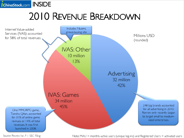 The company's revenue is mostly advertising and gaming add-ons, although a very tiny "group buying" site Noumi.com (launched last summer) is part of the mix.