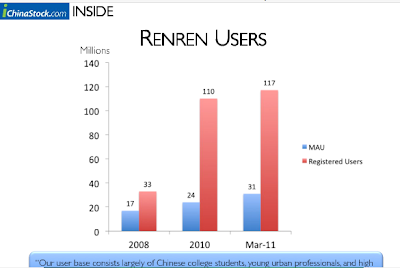 iChinastock has a nice 26 page slide on RenRen that can be viewed here. One can see one troubling issue is 'active users' - while growing - is not growing anywhere near the pace of Weibo, which has been reported to add 10M a month. Further, many of RenRen's users are not active - hence the 117M 'users' is simply a note of registrations, not who is using the site. Twitter in the US has a similar problem actually.