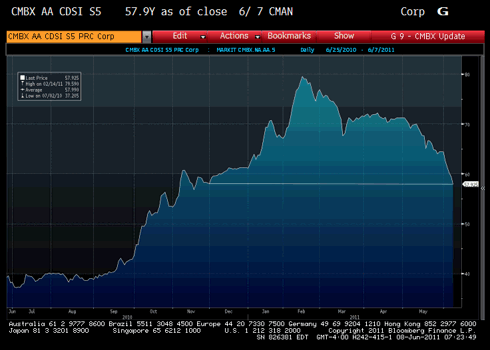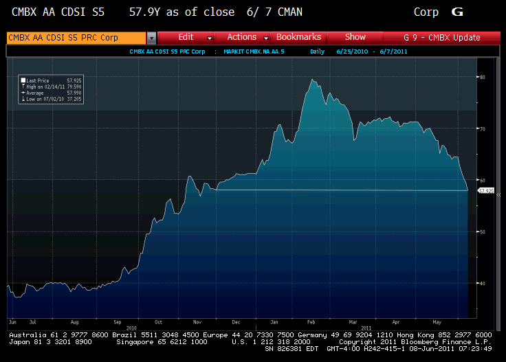 While true that CMBX is one of the least liquid CDX indices, the move has been pretty dramatic. The CMBX AA is now at levels last seen in November. The performance of other components of the CMBX index (AJ, AM, AAA) is similar. The CMBX and CMBS markets are worth watching as they escaped the high level of defaults that hit the ABX market in the crisis. There continues to be talk of new issues in the CMBS space and (IYR) has performed well, but this move in CMBX has to be more than dealers (or clients) just hedging ahead of some new issues, otherwise, the state of liquidity in that market is even more abysmal than I thought.