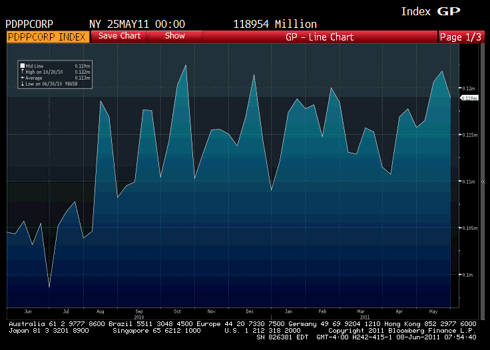 According to Bloomberg, IG16 is trading 3.5 bps cheap to fair value. As I wrote last week, the longer this cheapness exists, the more risk there is that it starts a self reinforcing move wider as the pressure the arbs put on single name spreads has a greater impact than the support they give the index. One theory to explain the cheapness is that with single names rolling on June 20th, people have been reluctant to put on hedges in single name CDS, so the index has taken on a disproportionate amount of the hedging trades.