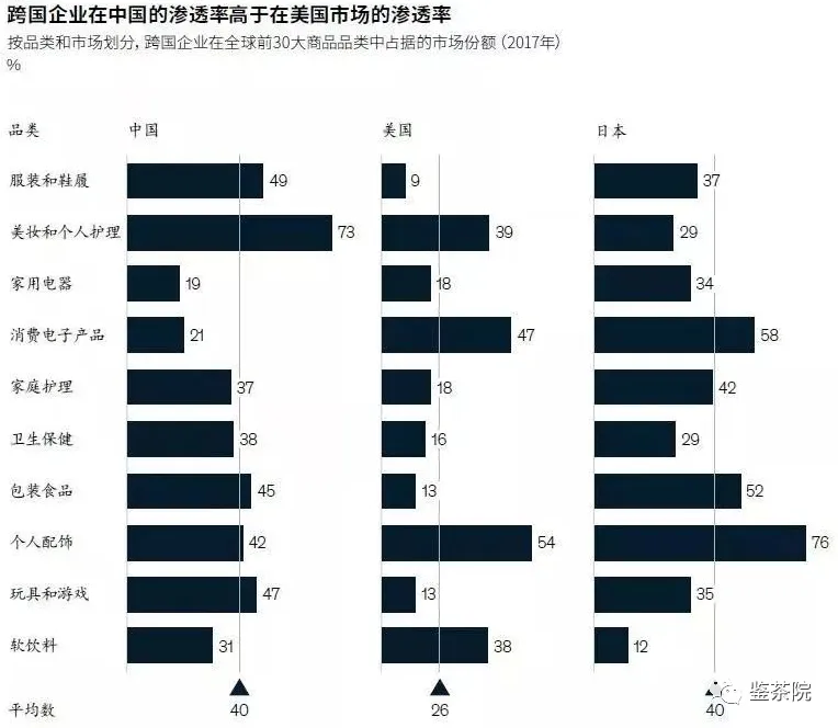 我们就拿消费品来说,中国十大消费领域的30种顶尖品牌中,在华外企的平均市场渗透率为40%,在美国这一比例仅为26%。某些行业的渗透率甚至更高,在美妆和个人护理领域中,跨国企业的渗透率高达73%!