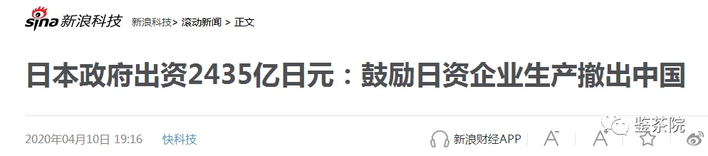 依据之一是为应对新冠疫情对于经济带来的负面影响,日本经济产业省推出了总额高达108万亿日元(约合人民币7万亿元)的抗疫经济救助计划,但其中有一个“改革供应链”的项目,专门列出2435亿日元(约合人民币158亿元)资金,用于资助日本制造商将生产线撤出中国,以实现生产基地的多元化。