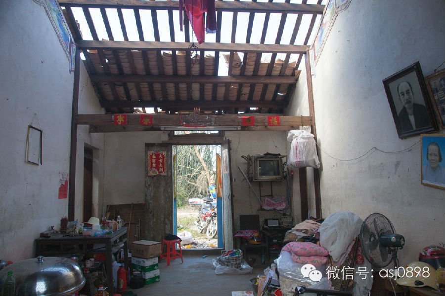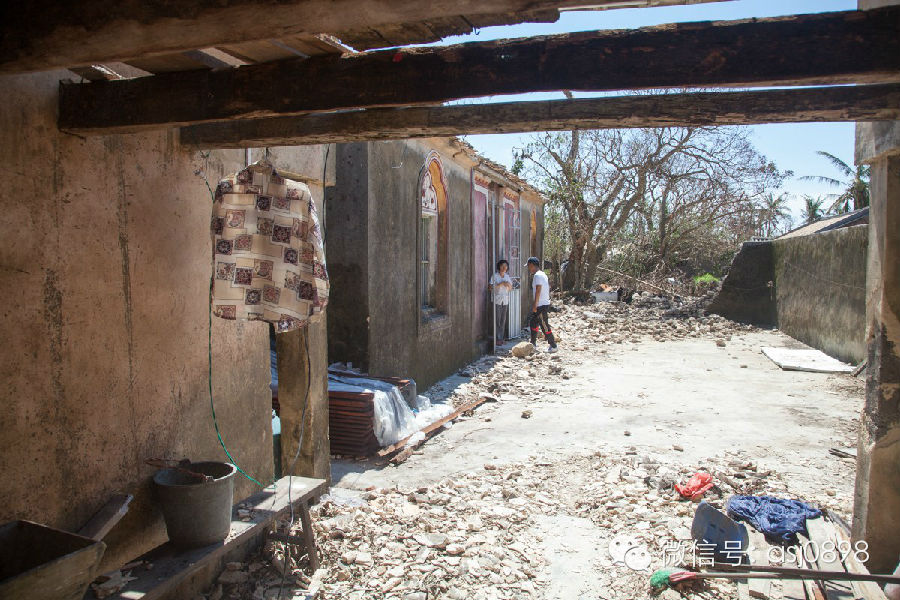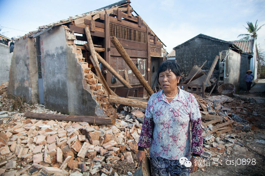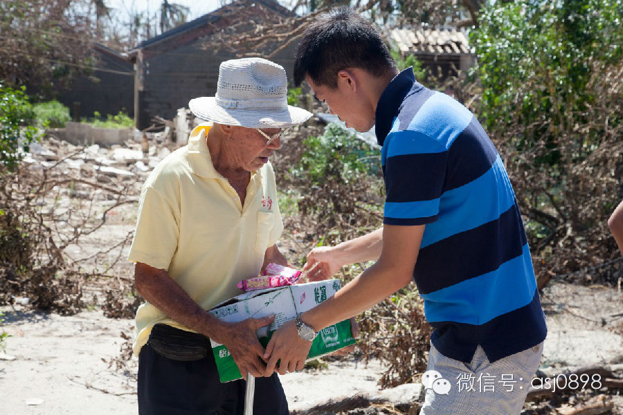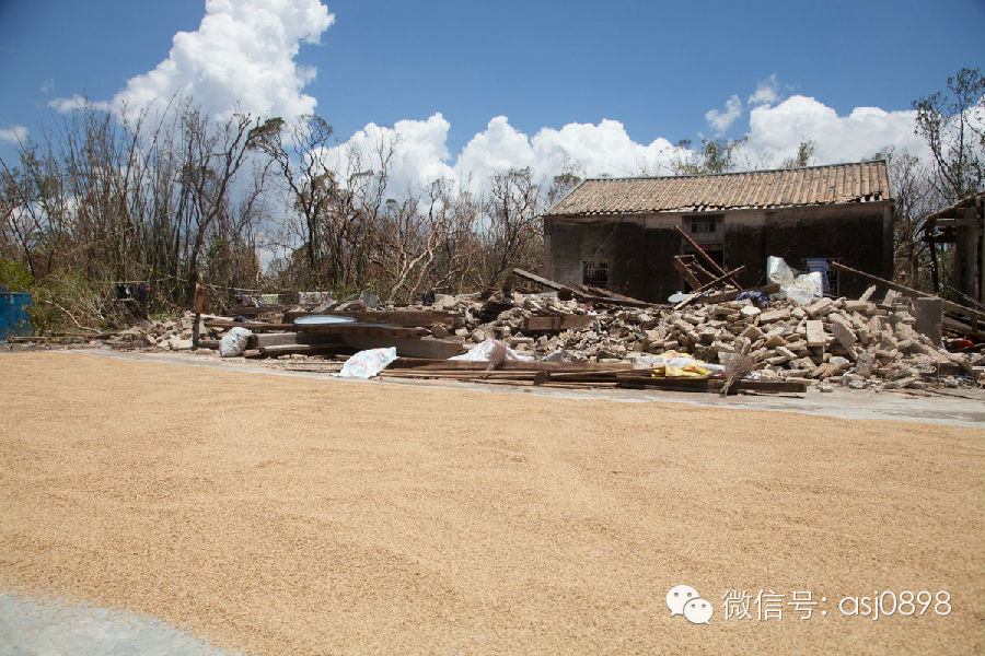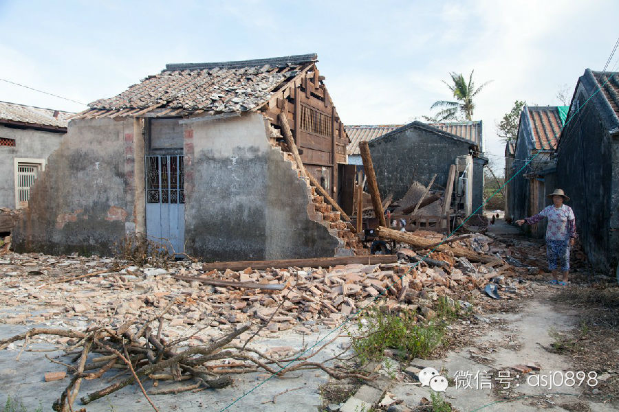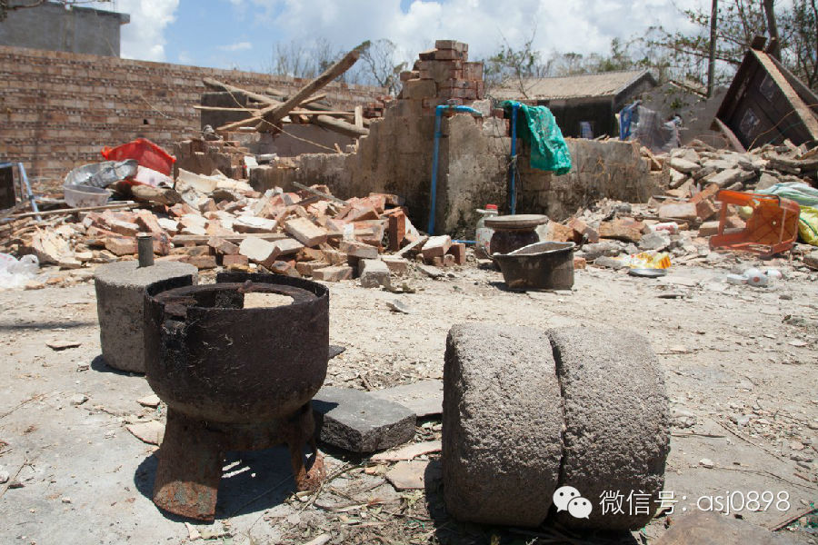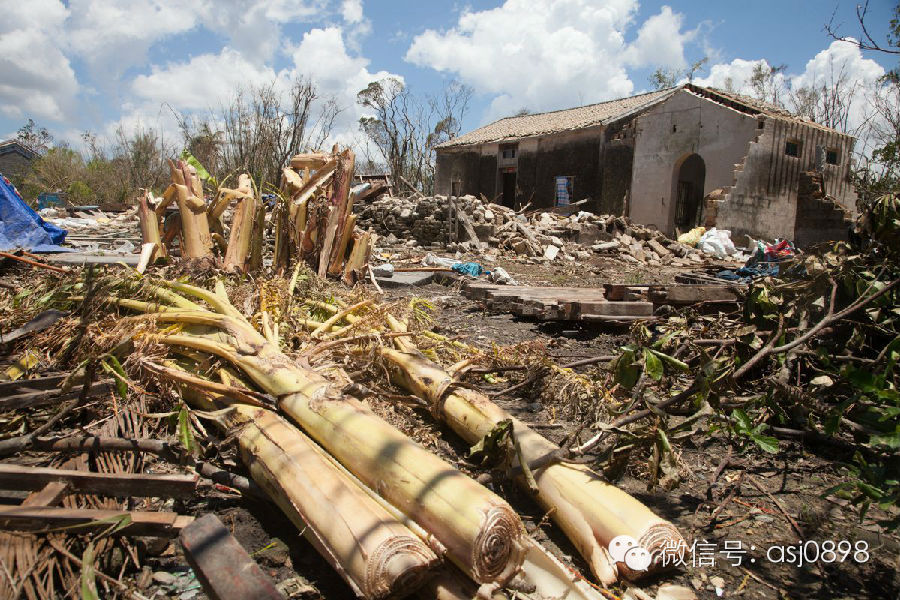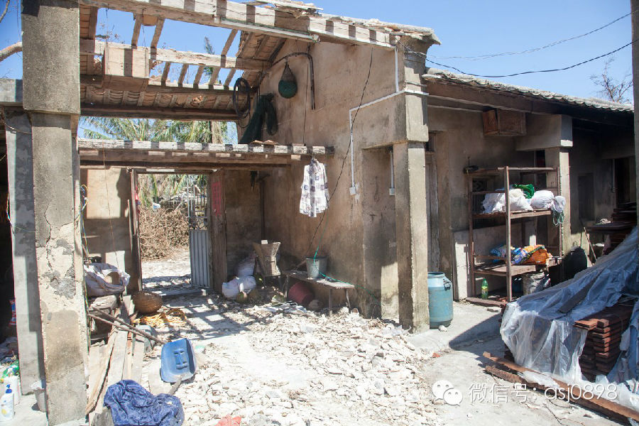 所 到之处都是满目疮痍,惨不忍睹,一片片香蕉林被折断,收成无望;很多西瓜已经烂在了田头,几位农户正在抢收那些幸存的好瓜。因为不熟悉路,我们车队开到了 海边竟然没有看到村庄,海边的几个村民告诉我们这里是台风的登陆点,并表示要带我们去村庄,我们心头一阵欣喜。在村民的引导下,我们穿过了一片白色的沙 田,来到了翁田镇邦庆村堆头大队。我们首先进入的一户村民家,一位阿婆和一位中年妇女坐在堂屋内,阳光透过没有瓦片的屋顶射到了地面上。俩人见我们的突然 到访,如同见到了救星般,满含眼泪的跟我们诉起了苦,当我们志愿者把一瓶矿泉水打开递给阿婆时,阿婆的眼睛泛起了泪花。阿婆和阿公平时在这屋里相依为命, 儿女都不在身边,阿公在台风来临时为了护住大门,被倒下的大门砸伤现已住院……