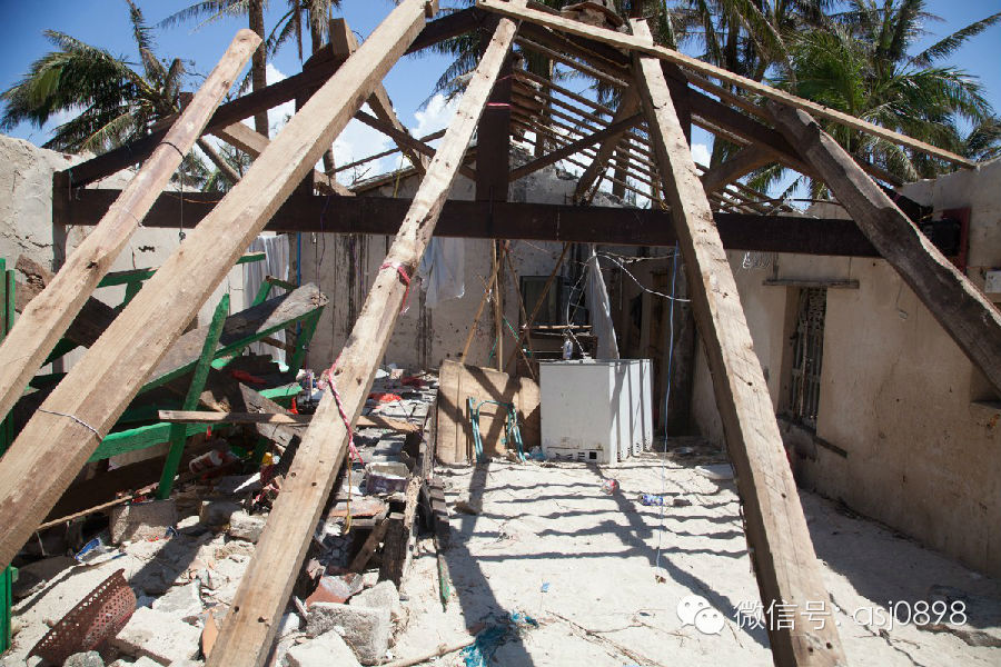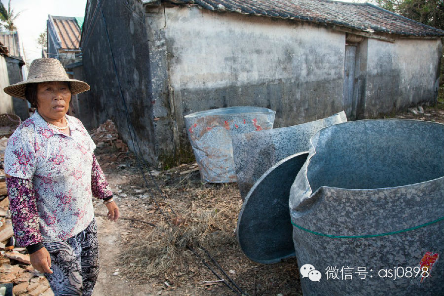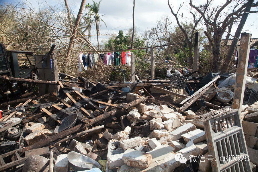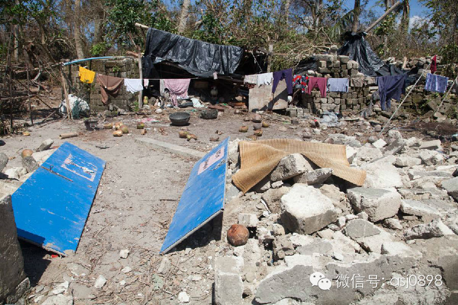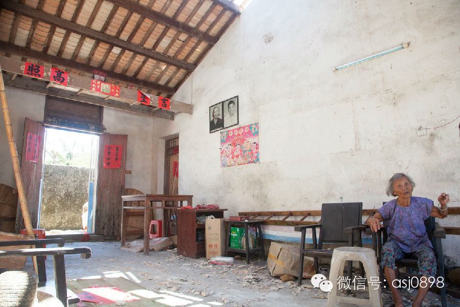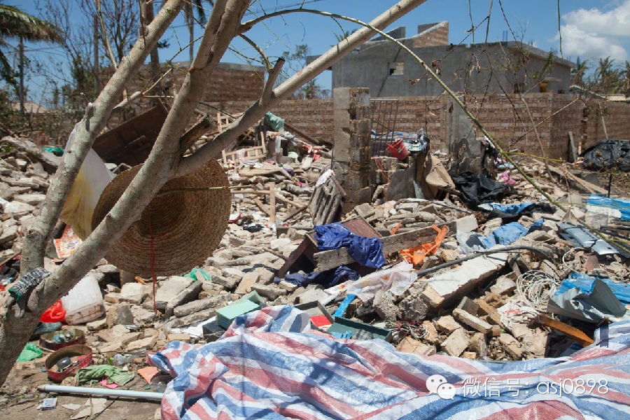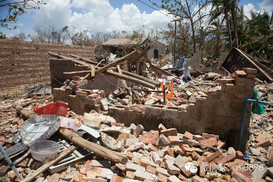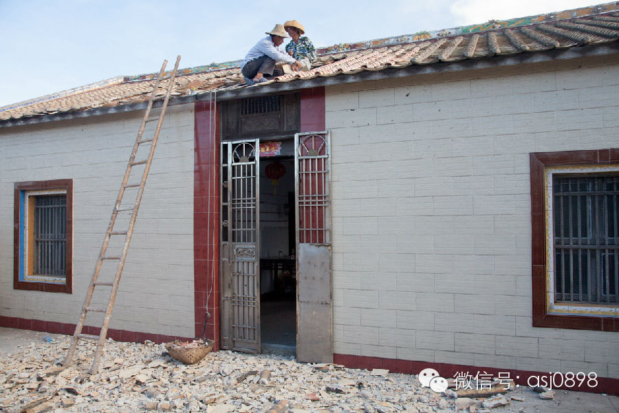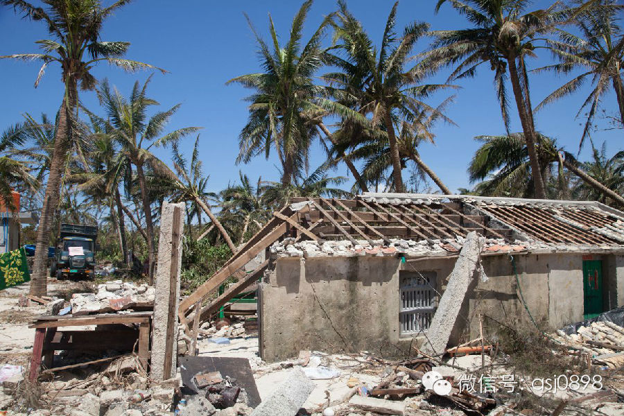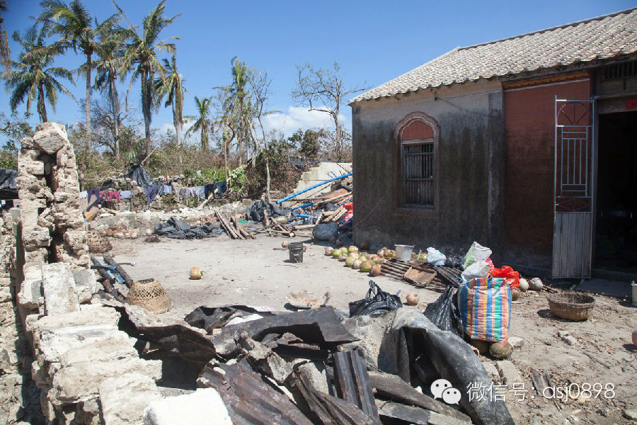 所 到之处都是满目疮痍,惨不忍睹,一片片香蕉林被折断,收成无望;很多西瓜已经烂在了田头,几位农户正在抢收那些幸存的好瓜。因为不熟悉路,我们车队开到了 海边竟然没有看到村庄,海边的几个村民告诉我们这里是台风的登陆点,并表示要带我们去村庄,我们心头一阵欣喜。在村民的引导下,我们穿过了一片白色的沙 田,来到了翁田镇邦庆村堆头大队。我们首先进入的一户村民家,一位阿婆和一位中年妇女坐在堂屋内,阳光透过没有瓦片的屋顶射到了地面上。俩人见我们的突然 到访,如同见到了救星般,满含眼泪的跟我们诉起了苦,当我们志愿者把一瓶矿泉水打开递给阿婆时,阿婆的眼睛泛起了泪花。阿婆和阿公平时在这屋里相依为命, 儿女都不在身边,阿公在台风来临时为了护住大门,被倒下的大门砸伤现已住院……