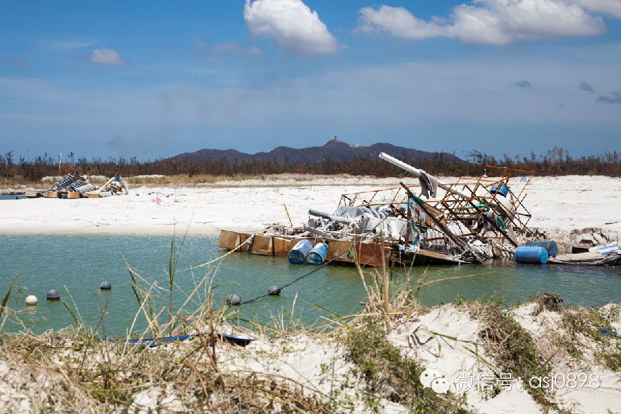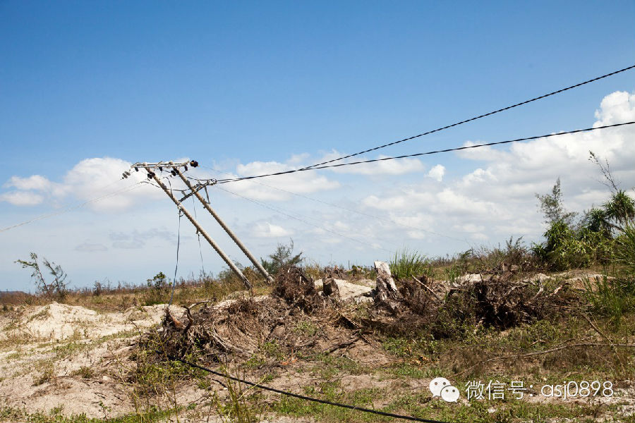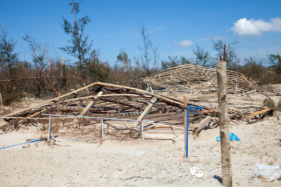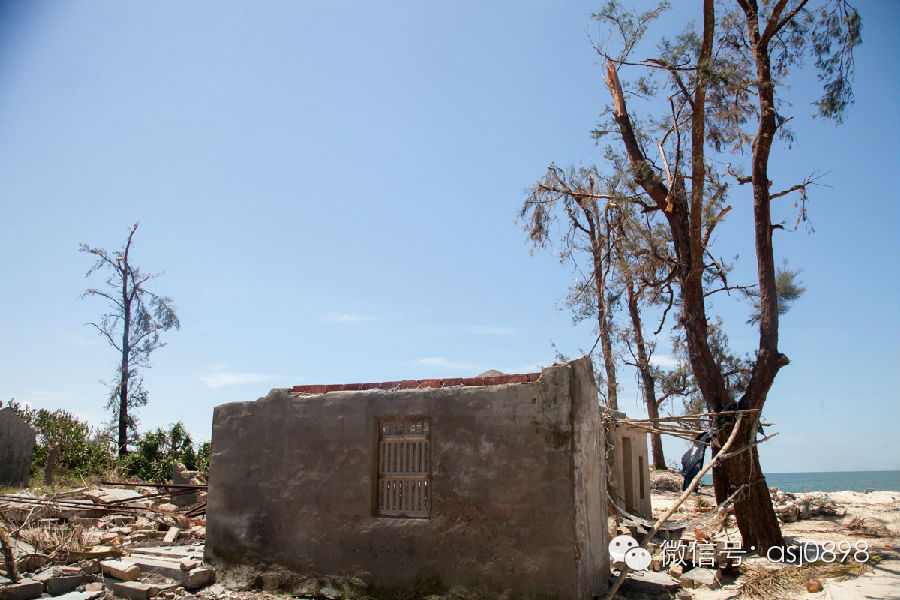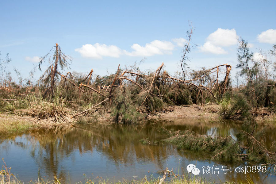海 文高速公路的两边,大部分昔日如钢铁巨人般耸立的广告架,现在都已经倒下,如废铁般四处散落在路边的草丛里。下了高速公路进入乡村公路,眼前的景象令我们 惊呆了,道路两边郁郁葱葱的高大防风林现在都已经成了拦腰折断的枯树,很多大树被台风拧得像一团麻花。越往海边驶近,越像是进入了一片荒漠。