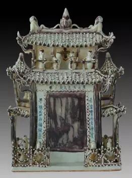 青花釉里红瓷仓,元代楼阁式瓷仓,1974年江西省景德镇出土,现藏于江西省博物馆。这件楼阁式瓷仓,造型别致,虽然是随葬冥器,仍不失为珍贵的工艺品。青花釉里红瓷器,甚为罕见,作为楼阁式瓷仓,并且有明确纪年,迄今仅为孤例。