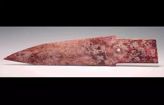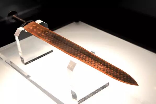 越王勾践剑,春秋晚期越国青铜器,1965年湖北省江陵县望山一号墓出土。越王勾践剑,剑通高55.7厘米,宽4.6厘米,柄长8.4厘米,重875克,极其锋利。因剑身上被镀上了一层含铬的金属而千年不锈,越王勾践剑被称为“天下第一剑”。