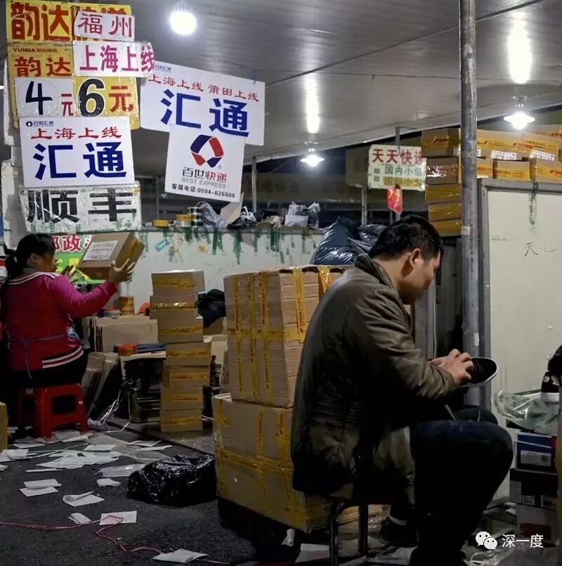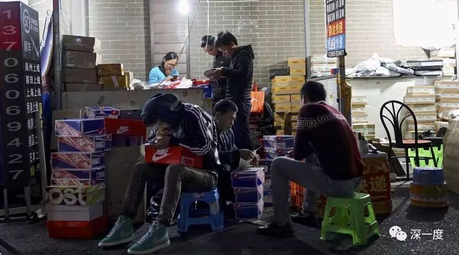 电商城里的另一侧,则是快递的天下,几乎稍有名气的快递公司都可以找得到,快递员大都在忙着填单发货,封装胶带的声音响成一片。包装的的瞬间能够清楚的看到他们手中的鞋盒,不是耐克、阿迪达斯,就是新百伦。