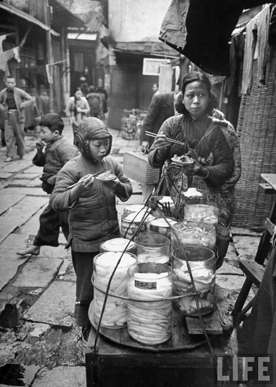 1949年3月,广州,在小吃摊上吃东西的人。卡尔·迈当斯/摄。