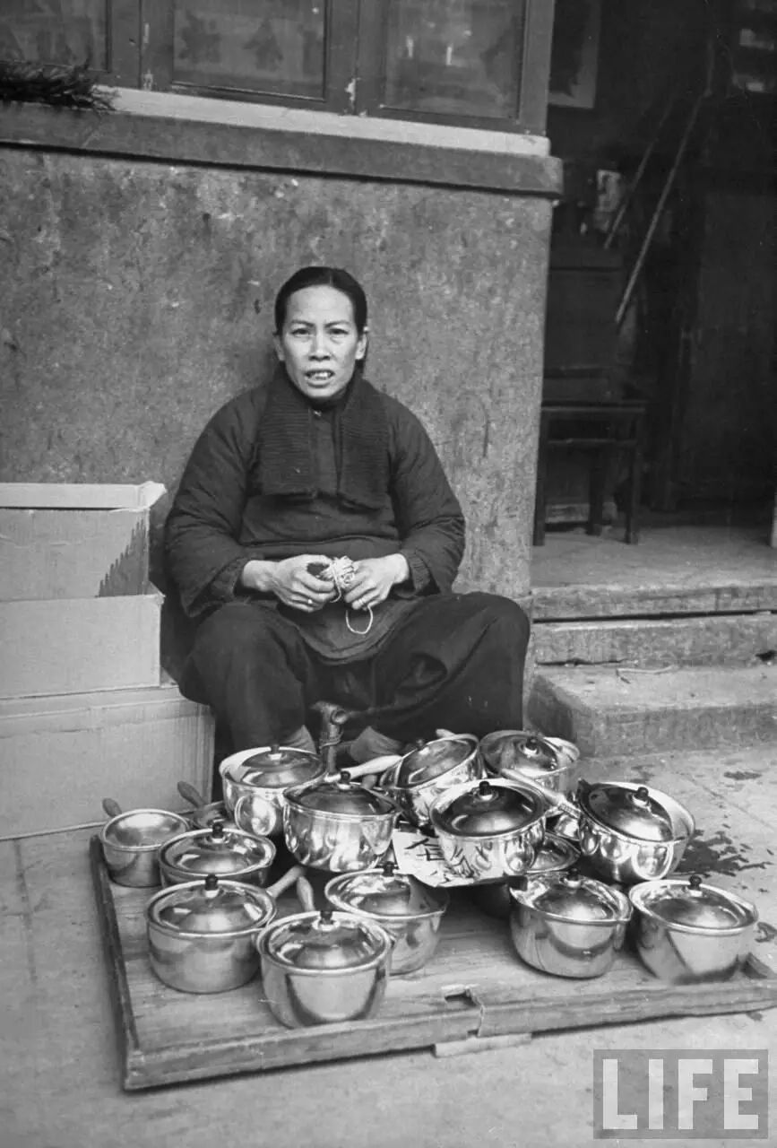 1949年3月,广州,一个卖炊具制品的摊贩。卡尔·迈当斯/摄。